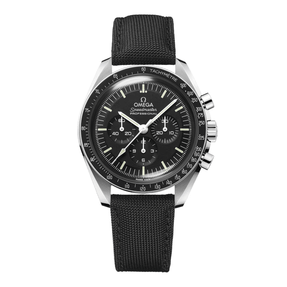 The Speedmaster Moonwatch is one of the world’s most iconic timepieces. Having been a part of all six moon landings, the legendary chronograph is an impressive representation of the brand’s adventurous pioneering spirit.Presented on a nylon fabric strap, this 42 mm Moonwatch in stainless steel features hesalite glass on the front and an embossed Seahorse medallion on the caseback. Inspired by the 4th generation Speedmaster style worn on the moon, it also includes an asymmetrical case, black step dial and the famous dot over 90 on the anodised aluminium bezel ring.The watch is driven by the OMEGA Co-Axial Master Chronometer Calibre 3861, which powers the small seconds sub-dial, 30-minute recorder and 12-hour recorder, along with the central chronograph function.