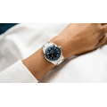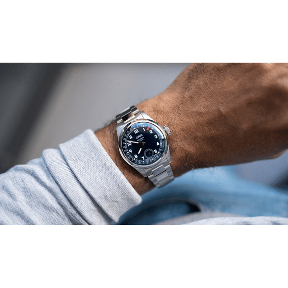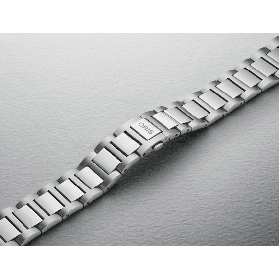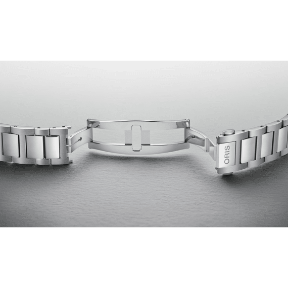 De Big Crown Pointer Date met een diameter van 38,00 mm is een van de meest veelzijdige ontwerpen van Oris. Het horloge is voorzien van de iconische Pointer Date-functie en heeft een nachtblauwe wijzerplaat. Het wordt nu ook geleverd met een H-link metalen armband met een ergonomische, door Oris ontwikkelde sluiting.