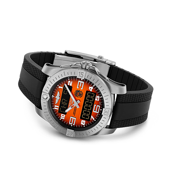 De pilotenchronograaf voor avonturiers – compleet met een levend stukje geschiedenis. Op 21 maart 1999 voltooiden Bertrand Piccard en Brian Jones de eerste non-stop rondreis om de wereld in een ballon. Ze landden in de Egyptische woestijn en legden met hun Breitling Orbiter 3 een afstand van 45.633 km af in 19 dagen, 21 uur en 47 minuten. Ter ere van de 25e verjaardag van deze prestatie heeft Breitling de Aerospace B70 Orbiter uitgebracht. Dit horloge, met een feloranje wijzerplaat die de kleur van de capsule weerspiegelt en versierd is met het missielogo, wordt geleverd met een titanium of zwarte rubberen band. De titanium kast, gekozen vanwege de superieure sterkte-gewichtsverhouding, herbergt het COSC-gecertificeerde Breitling Manufacture Calibre B70. Dit SuperQuartz™-uurwerk, tien keer nauwkeuriger dan standaard quartz, stuurt een veelvoud aan functies aan, waaronder een chronograaf met een nauwkeurigheid van 1/100e seconde (met tussentijd en rondetijd), een afteltimer, een tweede tijdzone, twee alarmen en een eeuwigdurende kalender. Het mooiste is dat elk speciaal horloge een levend stukje geschiedenis bevat: een segment van de originele ballon, zichtbaar door de open achterkant van de kast.