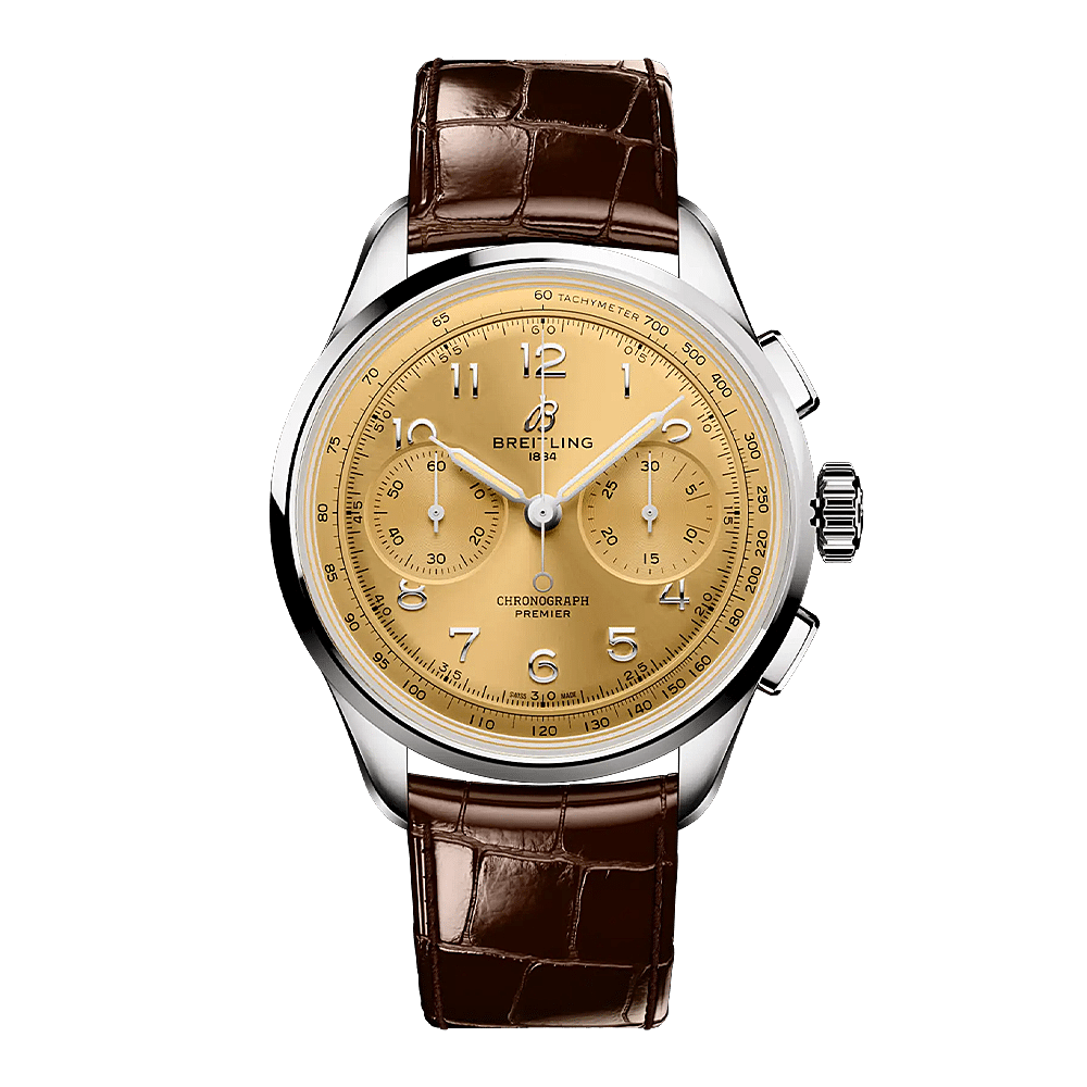 Als eerbetoon aan drie generaties uitvinders - Léon, Gaston en Willy Breitling - belichaamt de Premier-collectie Breitlings nalatenschap als uitvinder van de moderne chronograaf. Zoals Willy Breitling het uitdrukte, is de Premier de “onmiskenbare stempel van onberispelijke smaak”. De moderne Premier-collectie brengt deze geschiedenis weer tot leven en toont Breitling's hoogste niveau van horlogemaken. Het wordt geleverd met een reeks complicaties: de Chronograaf, de Duograaf gespleten seconde, de Datora volledige kalender en de Tourbillon. Het herleefde design van de Premier Chronograph heeft een verscheidenheid aan elegante ontwerpdetails, zoals groeven op de zijkanten van de kast, rechthoekige drukkers, toegepaste Arabische cijfers en wijzers met vintage-inspiratie. Het heeft ook een open saffier caseback die het handmatig opgewonden COSC-gecertificeerde Breitling Manufacture Caliber B09 prachtig weergeeft.