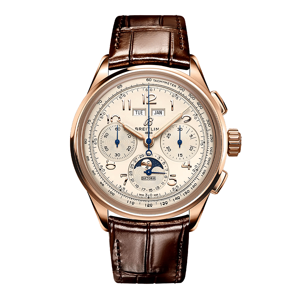 Als eerbetoon aan drie generaties uitvinders - Léon, Gaston & Willy Breitling - is de Premier Datora de meest verfijnde Breitling chronograaf met zijn volledige kalender en maanfase. Zoals Willy Breitling zei, is de Premier een “onmiskenbaar stempel van onberispelijke smaak”. Deze nieuwste generatie Premier chronografen brengt de tijdloze elegantie weer tot leven en toont Breitling's hoogste niveau van horlogemakerij dankzij een reeks iconische Premier complicaties: de Chronograaf, de Duograaf en de Datora. De Premier Datora is voorzien van rechthoekige chronograafdrukkers en Arabische cijfers, en vertoont een verscheidenheid aan elegante ontwerpdetails zoals groeven op de zijkanten van de kast, open saffieren kastruggen en wijzers met vintage-inspiratie. De Datora is verkrijgbaar in twee varianten: in roestvrij staal met een koperen wijzerplaat en een bruine alligatorband of in 18k roodgoud met een zilveren wijzerplaat en een bruine alligatorband. “Datora” was een term die door Breitling werd gebruikt in de jaren 1940 en verwijst naar een complete kalenderchronograaf die dag, datum, maand en de verschillende maanfasen weergeeft. De Datora wordt aangedreven door het cosc-gecertificeerde Manufacture Caliber B25.