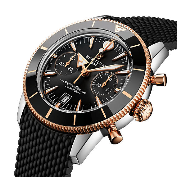 Gemaakt om te bewegen tussen de golven en de waterkant. De Superocean Heritage is geen gewoon zeehorloge - dat is het nooit geweest. Toen Breitling het voor het eerst lanceerde in 1957, ging het over een andere boeg dan andere duikhorloges uit die tijd. De Ref. 1004 (een slank stuk dat alleen voor de tijd geschikt was) en Ref. 807 ('s werelds eerste speciale duikchronograaf) waren niet alleen bedoeld om de onderwaterwereld te verkennen, ze wilden er ook goed uitzien. De speer-en-pijl wijzers, keramische draaiende lunette en natuurlijk slanke proporties maakten het een favoriet van stijlvolle avonturiers die leefden voor de zee en de scène. Vandaag de dag vormt die filosofie nog steeds de kern van de Superocean Heritage. Het heeft de ziel van de jaren 1950, maar is ontworpen voor vandaag. De nieuwste Superocean Heritage bouwt voort op alles wat het origineel onderscheidend maakte en scherpt het aan. De chronograaf wordt aangedreven door het Breitling Manufacture Caliber 01, Breitling's toonaangevende uurwerk. Een keramisch ingelegde lunette voegt een uitzonderlijke krasbestendigheid toe, terwijl de geïntegreerde mesh-metalen of mesh-rubberen armbanden strak tegen de kast passen, vastgezet met vouwsluitingen voor een schone, waterdichte afwerking. Toon-op-toon subdials, een discreet datumvenster op zes uur en de originele kenmerkende wijzers - pijl voor uren, speer voor minuten - zorgen voor leesbaarheid en balans, boven of onder het oppervlak.