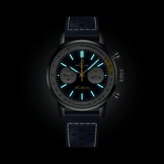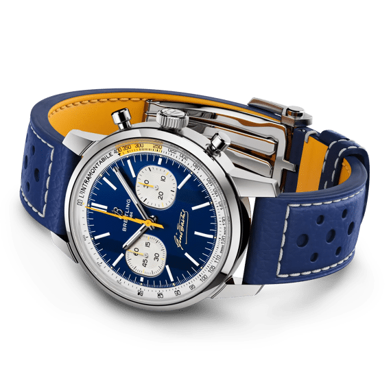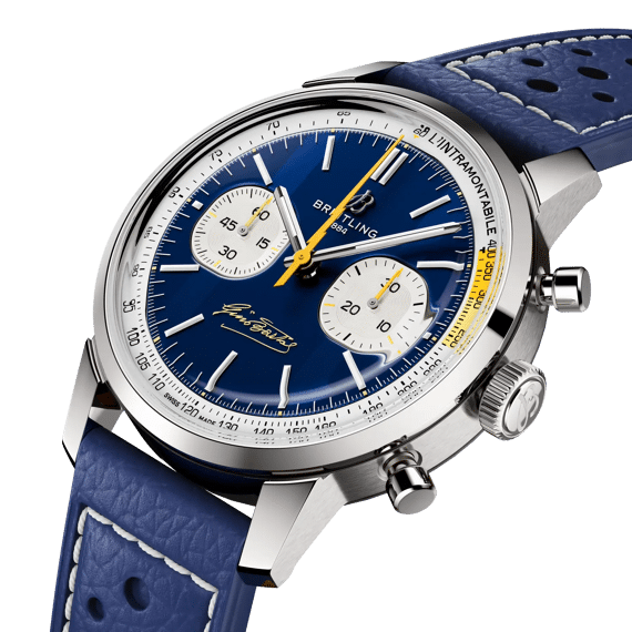 De onconventionele lijn van door de racerij geïnspireerde chronografen van Willy Breitling, geïntroduceerd in de transformatieve jaren 60, weerspiegelde de ongedwongen sfeer van die tijd. Vandaag de dag brengt de nieuwe Top Time-collectie die adrenaline-geladen energie over, door een modern-retro design te combineren met geavanceerde prestaties. Fausto Coppi en Gino Bartali waren niet alleen kampioenen, ze waren ook symbolen van sportiviteit. Beiden waren ambassadeurs van Breitling in een tijd waarin het merk de officiële tijdwaarnemer was van de grootste wielerwedstrijden en hun liefde voor de sport miljoenen mensen inspireerde. De Top Time B01 Gino Bartali heeft een blauwe wijzerplaat met gele accenten, geïnspireerd op zijn memorabele trui. De chronograaf is voorzien van Bartali's bijnaam op de tachymeterschaal: “L'Intramontabile” (De Tijdloze), en zijn handtekening op zes uur maakt de connectie nog persoonlijker. De 41 mm chronograaf loopt op Breitling's Manufacture Caliber 01, met COSC-gecertificeerde precisie en een gangreserve van 70 uur. Een transparante achterkant onthult het ingewikkelde uurwerk, met op de buitenste ring de gravure ‘Gino Bartali Tribute’ en ‘One of 750’. De Top Time B01 Bartali, onvergetelijk in zijn tijd en opnieuw ontworpen voor de onze, eert de veerkracht en vriendschappen die zelfs in de felste competitie zijn gesmeed.