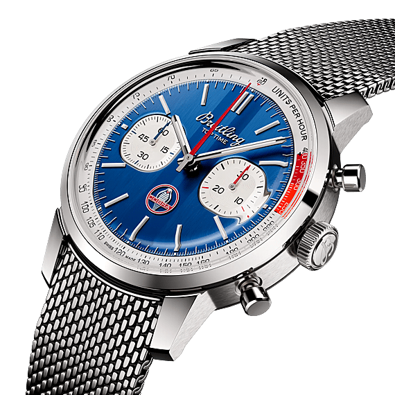 De jaren 1960 waren een decennium van experiment, plezier, vrijheid en energie. Of het nu ging om cruisen op een motorfiets of het opvoeren van een sportwagen, het leven op volle snelheid was aan de orde van de dag. Willy Breitling voelde deze verandering van tempo en besloot een onconventionele chronograaf te ontwerpen die de verve van dit tijdperk zou vangen. Hij noemde het de Top Time. Die pittige traditie wordt vandaag de dag voortgezet met Breitling die samenwerkt met enkele van de coolste namen in de auto-industrie om zijn Top Time-ontwerpen te creëren. De Ford Thunderbird werd voor het eerst onthuld op de autoshow van Detroit in 1954. Het werd aangeprezen als een leuk rijdende cabriolet die zijn aanwezigheid liet voelen met zijn luxueuze design, solide bouw en dramatische staartvin. De Top Time B01 Ford Thunderbird heeft de kleuren en het embleem van zijn klassieke tegenhanger, evenals een raceband van geperforeerd leer, een tachymeter-schaal die de snelheid meet en contrasterende “squircle” (niet helemaal vierkant, niet helemaal rond) subdials die het gevoel geven van vintage dashboardmeters. Onder de motorkap zit ook een opschepmotor: het uitzonderlijke Breitling Manufacture Caliber 01.