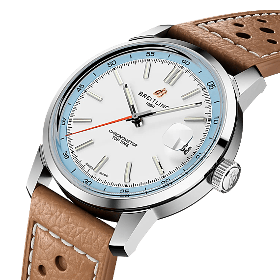 Nieuw gelanceerd in 2025, markeert de Top Time B31 het debuut van het Manufacture B31 uurwerk bij Breitling. Een 38mm kast, trouw aan het Top Time DNA, voor een onberispelijke stijl die om elke pols past. De Top Time B31 combineert retro-esthetiek met een modern randje. Het ontwerp van de wijzerplaat is geïnspireerd op dashboardklokken uit klassieke auto's, terwijl de 38 mm kast een balans vindt tussen vintage proporties en eigentijds design, perfect voor elke pols dankzij de universele maat. Drie kleurstellingen - groen, blauw of een tweekleurige combinatie van wit en hemelsblauw - worden gecombineerd met een roestvrijstalen armband met drie rijen of een band van geperforeerd kalfsleer die een knipoog geeft naar racehandschoenen. Of je nu de open weg op gaat of gewoon het alledaagse doet, dit horloge is een viering van individualiteit en avontuur.