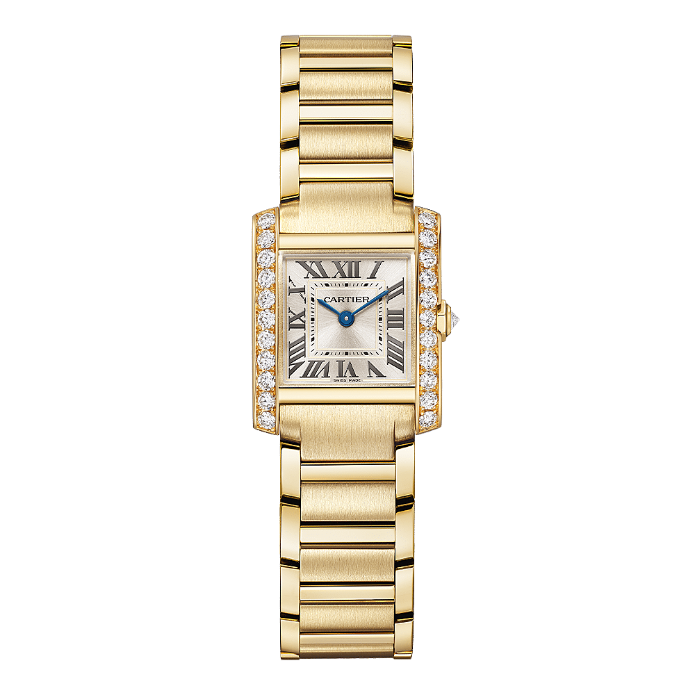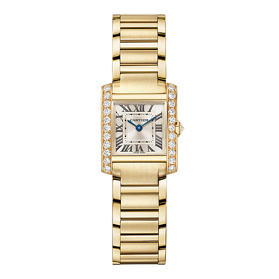 Tank Française-horloge, small model, quartz-uurwerk. Kast en gefacetteerde kroon van geelgoud 750/1000 bezet met 23 briljantgeslepen diamanten van in totaal 0,78 karaat. Gouden gezonnestraalde wijzerplaat, zwaardvormige wijzers van blauwkleurig staal, saffierkristal. Band van geelgoud 750/1000. Kastafmetingen: 25,7 mm x 21,2 mm, dikte: 6,8 mm. Waterbestendig tot 3 bar (ongeveer 30 meter).