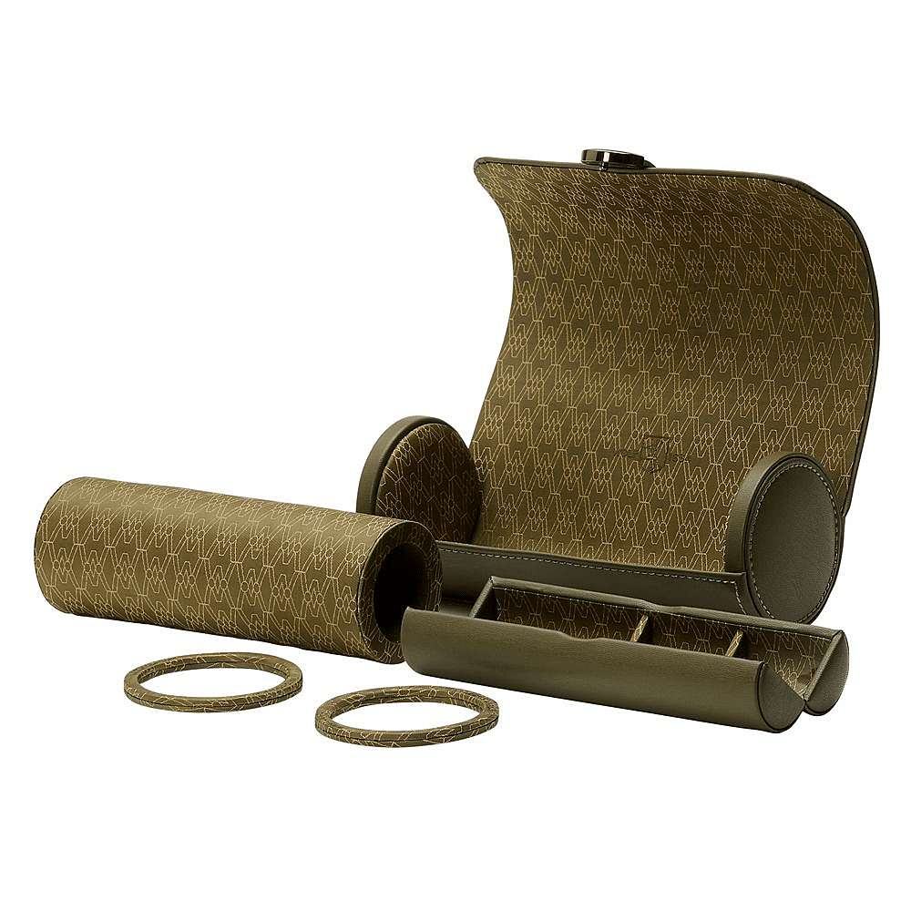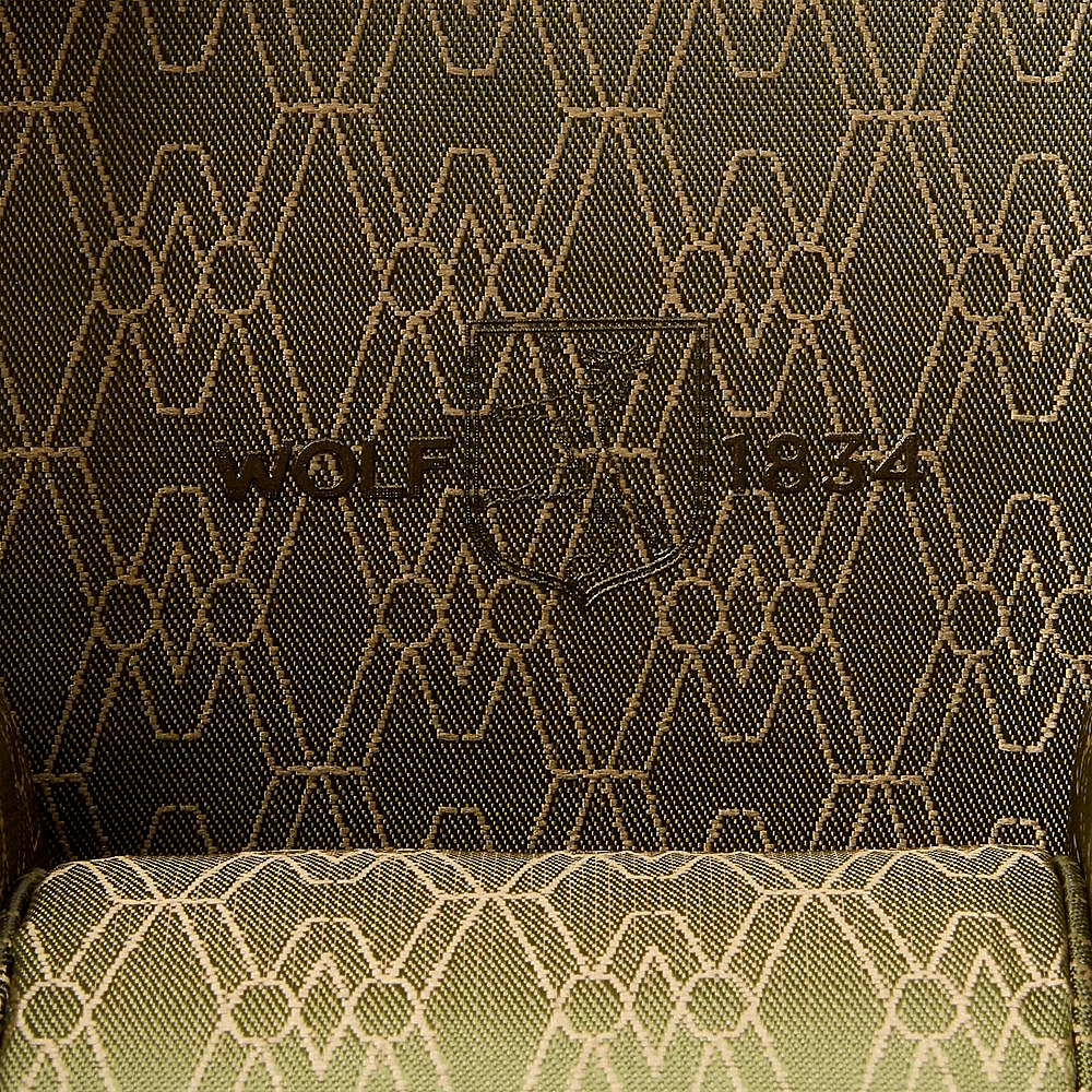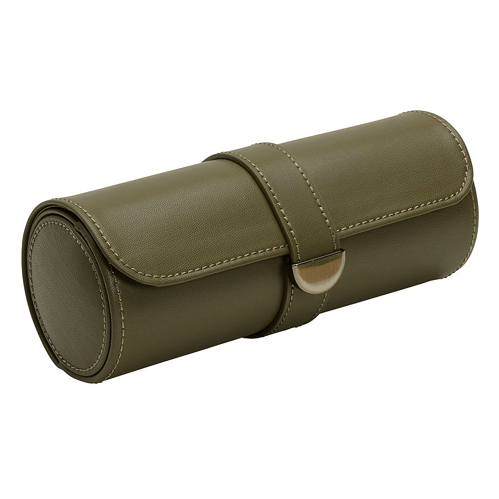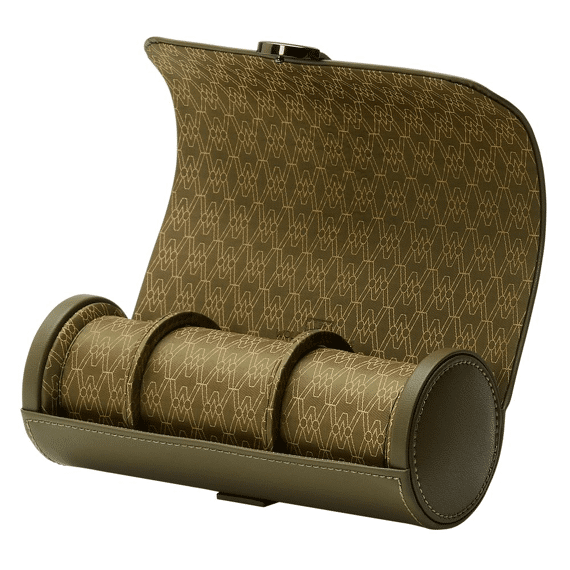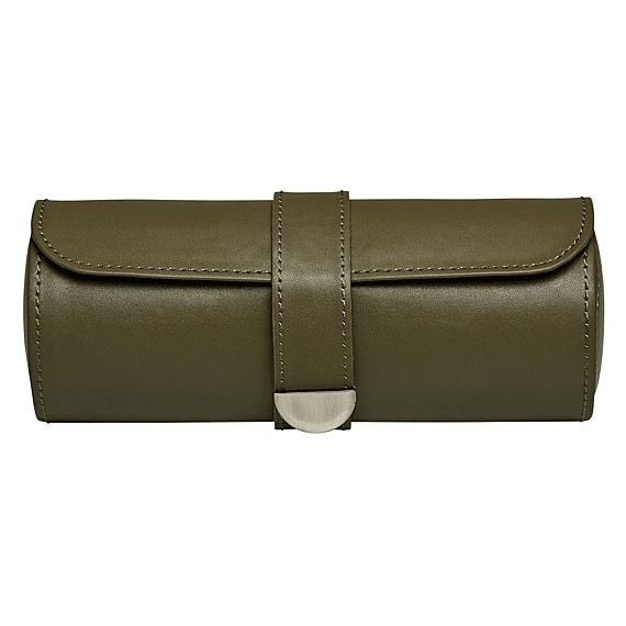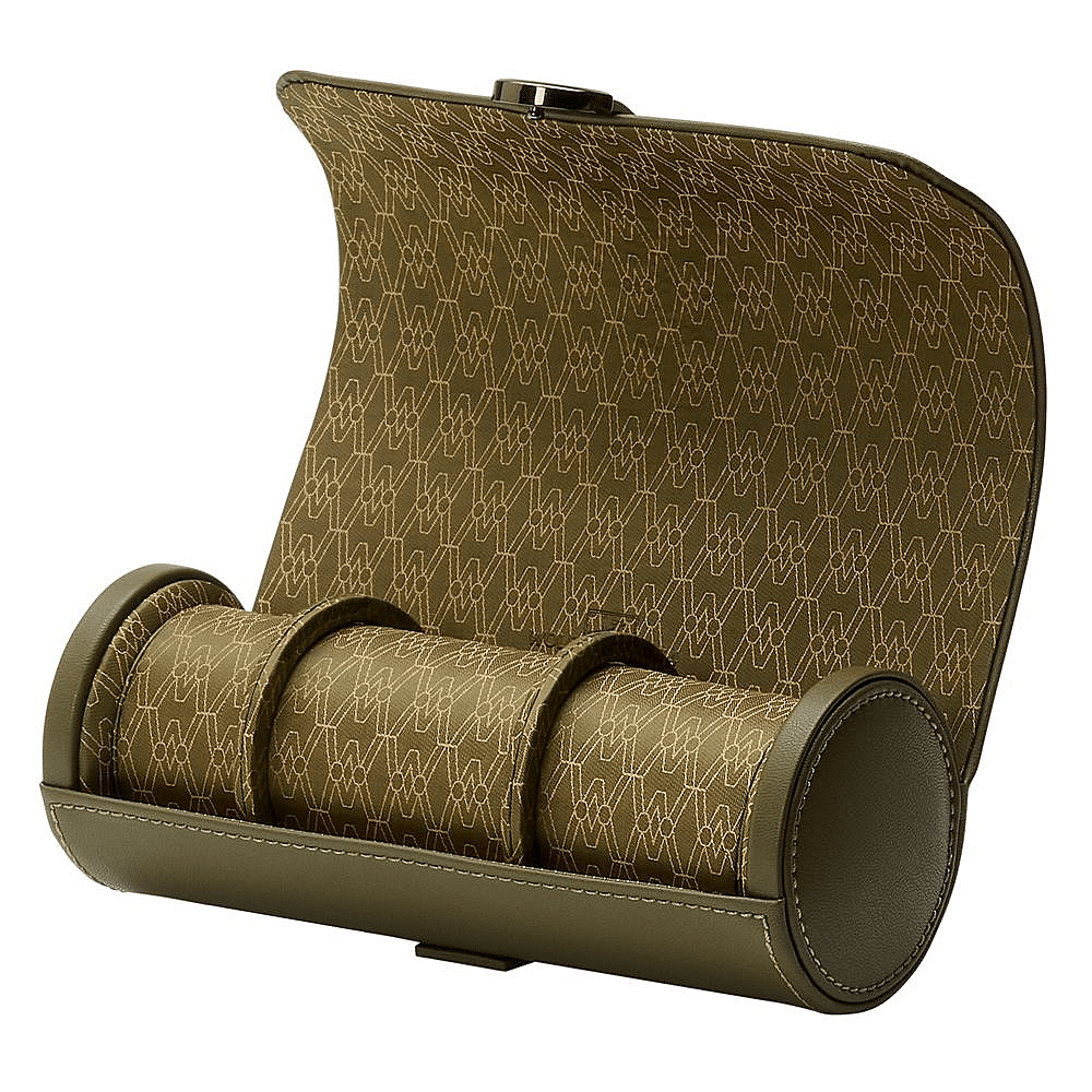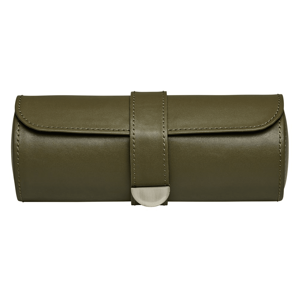 Earth Triple Watch Roll has an apple leather exterior with metallic closure. Inside a recycled satin jacquard interior with WOLF signature design offers storage for three watches and hidden capsule with three compartments for other valuables.