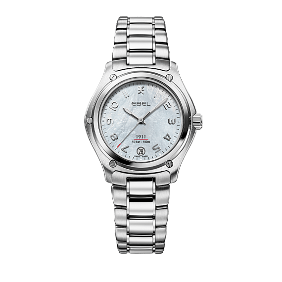 EBEL 1911 voor dames, roestvrijstalen kast, Ø 34mm, witte parelmoeren wijzerplaat met Arabische cijfers, datumvenster op 6:00, saffierglas met antireflecterende behandeling aan de onderkant, roestvrijstalen schakelarmband, vouwsluiting, wordt geleverd met extra stoffen band (gemaakt van gerecycled oceaangebonden plastic) met kurk insert, Zwitsers quartz uurwerk, waterbestendig tot 10 bar.