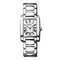 EBEL Brasilia-horloge, roestvrijstalen kast, 22,90 mm breed, gepolijste afwerking, witte opaline wijzerplaat met geschilderde Romeinse cijfers en minuutschaal, saffierglas met antireflecterende behandeling aan de onderkant, roestvrijstalen armband, Zwitsers quartz-uurwerk, waterbestendig tot 50 meter.