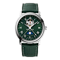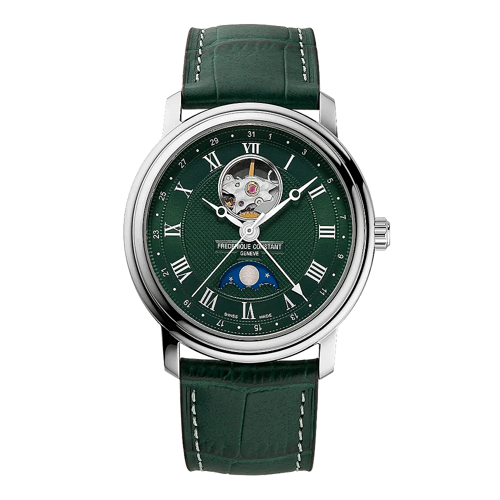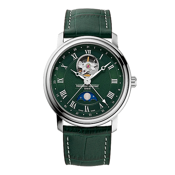 Ontdek het Classics Heart Beat Moonphase Date-horloge, een verfijnd uurwerk dat de ziel van zijn uurwerk onthult. De gepolijste roestvrijstalen kast van 40 mm herbergt het automatische kaliber FC-335, met een gangreserve van 38 uur en een frequentie van 28.800 vph, zichtbaar door het ‘Heart Beat’-venster op 12 uur. De matgroene wijzerplaat wordt verfraaid door een elegant ‘Clous de Paris’-guillochépatroon in het midden, witte Romeinse cijfers en een datumschaal rond de rand. De witte uur-, minuut-, seconde- en datumwijzers zorgen voor een optimale leesbaarheid, terwijl de maanfase een vleugje poëzie toevoegt. Dit horloge wordt beschermd door een bol antireflecterend saffierglas en een transparante achterkant, is waterdicht tot 6 ATM (60 m/197 ft) en wordt geleverd met een groene kalfsleren band met ecru stiksels, die klassieke elegantie en comfort combineert.