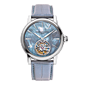 De combinatie van een tourbillon en parelmoer is ongebruikelijk. Zacht en warm onthult het subtiele schakeringen van grijs en blauw, die de zuiverheid van de 18-karaats witgouden kast versterken, evenals de schittering van de met de hand aangebrachte uurmarkeringen, de geblauwd stalen schroeven van de tourbillon met siliciumgangwerk en de oneindige nuances van het natuurlijke parelmoer. Een uitzonderlijk, stralend en lichtgevend uurwerk waarvan slechts 36 individueel genummerde exemplaren worden vervaardigd.