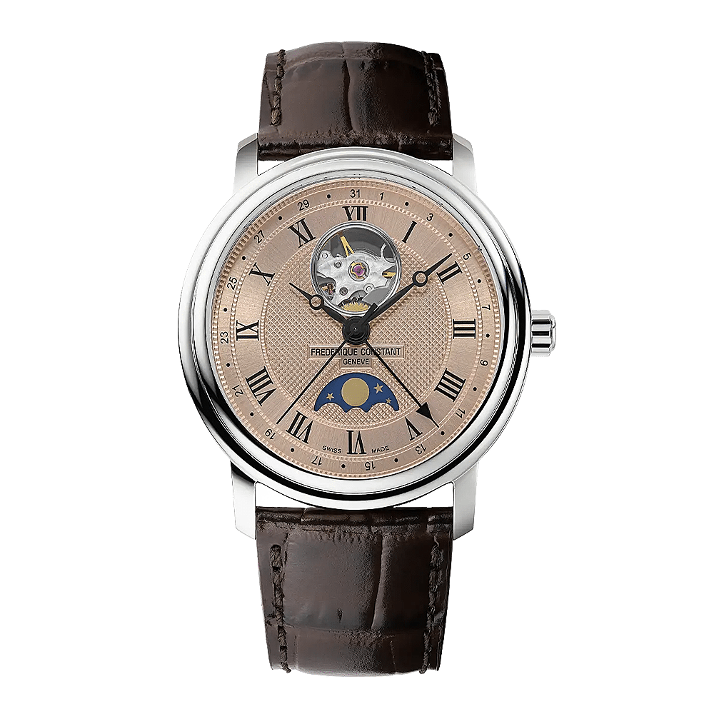 De Classics Heart Beat Moonphase Date is uitgerust met het automatische uurwerk FC-335 Heart Beat en heeft een rijkelijk versierde wijzerplaat: een klassieke Clous de Paris guilloché-versiering geaccentueerd met traditionele Romeinse cijfers. De emblematische opening op 12 uur, het kenmerk van de Heart Beat-uurwerken, onthult het continu bewegende echappement. Dit horloge is voorzien van uren, minuten, seconden, maanfase en een datumwijzer. De zalmkleurige wijzerplaat wordt aangevuld met een bruine leren band voor een werkelijk elegante uitstraling.