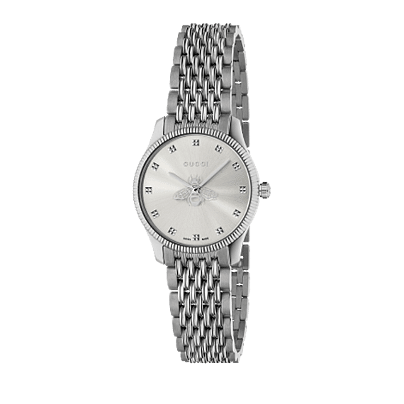 Gucci, opgericht in Florence in 1921, is een van 's werelds toonaangevende luxemerken met een benijdenswaardige reputatie op het gebied van exclusiviteit, kwaliteit en vakmanschap. De Zwitserse uurwerken en verfijnde Italiaanse sieraden van Gucci combineren moderniteit met erfgoed en vormen zo een innovatief merk dat bekendstaat om zijn trendsettende en geraffineerde stijl. Dit klassieke Gucci G-Timeless Bee Watch YA1265021, onderdeel van de G-Timeless collectie, heeft een traditionele uitstraling. De zilveren wijzerplaat van 29 mm is voorzien van een speels bijenembleem in het midden en sprankelende uurmarkeringen. Geleverd met een roestvrijstalen armband, is dit horloge de perfecte combinatie van luxe en stijl.