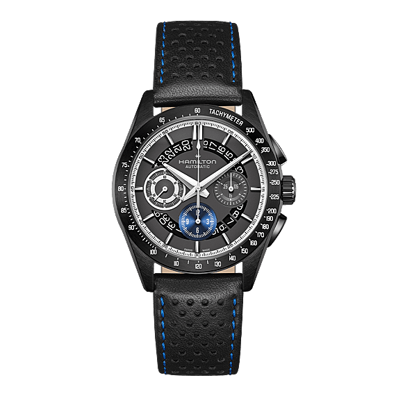 Tijdloze stijl met een nieuwe expressie, de Jazzmaster Performer Auto Chrono 42mm staat voor een eigentijdse kijk op het alledaagse horloge, met behoud van zijn kenmerkende sportieve karakter. Met de drie chronograafwijzers die de tijd op de buitenste ring weergeven, kunt u de verstreken uren, minuten en seconden bijhouden. De Jazzmaster Auto Chrono 42 mm heeft een slanke PVD kast en wordt gecombineerd met een zwarte leren horlogeband. Hij heeft een gangreserve van 60 uur en een H-31-uurwerk.