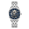 De 40mm Jazzmaster Skeleton met blauwe uitgesneden wijzerplaat legt het accent op precisie en biedt een blik op de subtiele schoonheid van de techniek van het uurwerk binnenin. De Jazzmaster Skeleton zet het H-10-S automatische uurwerk in de kijker, met een gangreserve van 80 uur en een balansveer van Nivachron™. De verfijnde roestvrijstalen band benadrukt het vakmanschap en de aandacht voor detail van Hamilton.