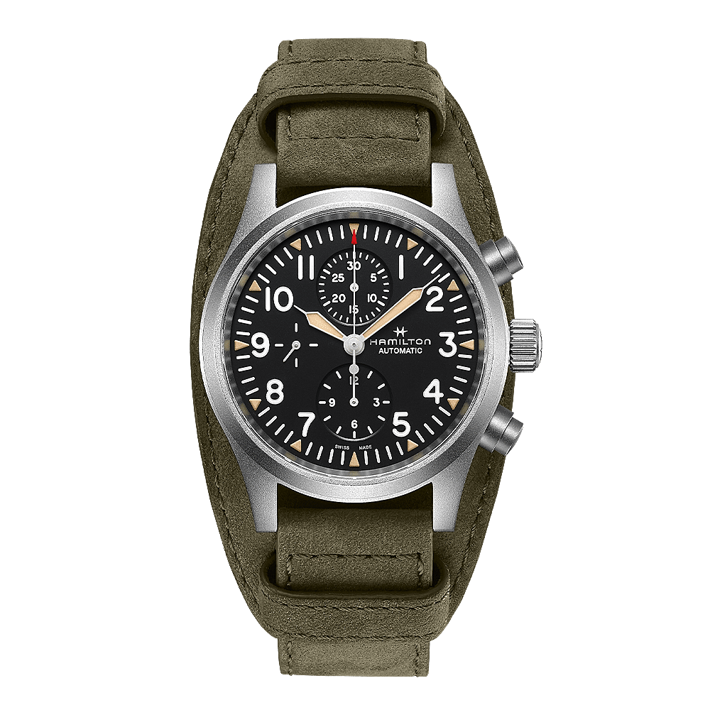 Robuust, veerkrachtig en nauwkeurig, de Khaki Field Automatic Chronograph is het perfecte horloge voor zelfverzekerde ontdekkingsreizigers. Een speciale gravure op de achterkant van de kast van dit 44 mm gezandstraalde roestvrijstalen veldhorloge brengt hulde aan het militaire erfgoed van Hamilton, en de verhoogde cijfers met SuperLuminova-coating geven de wijzerplaat extra leesbaarheid en diepte. In combinatie met een comfortabele lederen bundelband is dit hoogwaardige accessoire gemaakt voor avonturen in de buitenlucht.