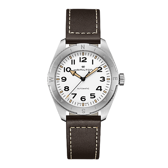 Maak u klaar voor het ruige buitenleven met de Khaki Field Expedition, een all-terrain avonturenhorloge met een kompasdesign waarmee u met behulp van de zon overal naartoe kunt navigeren. Dit horloge, met zijn behuizing in een roestvrijstalen kast van 41 mm en een bruin lederen band, is voorzien van een schroefbare kroon om het uurwerk onder alle weersomstandigheden te beschermen. De robuuste Khaki Field Expedition heeft een witte, getextureerde wijzerplaat met een Super-LumiNova®-coating voor optimale leesbaarheid.