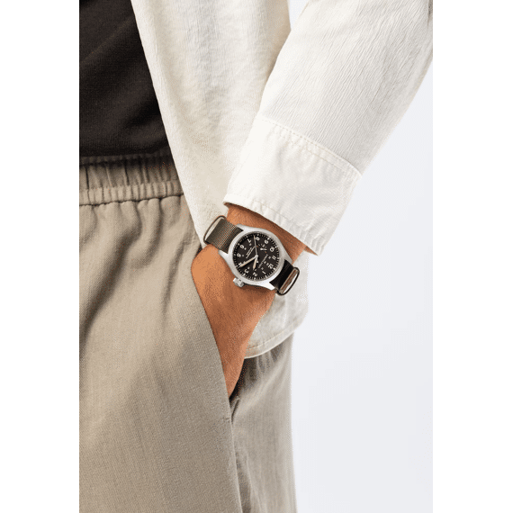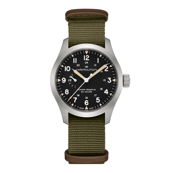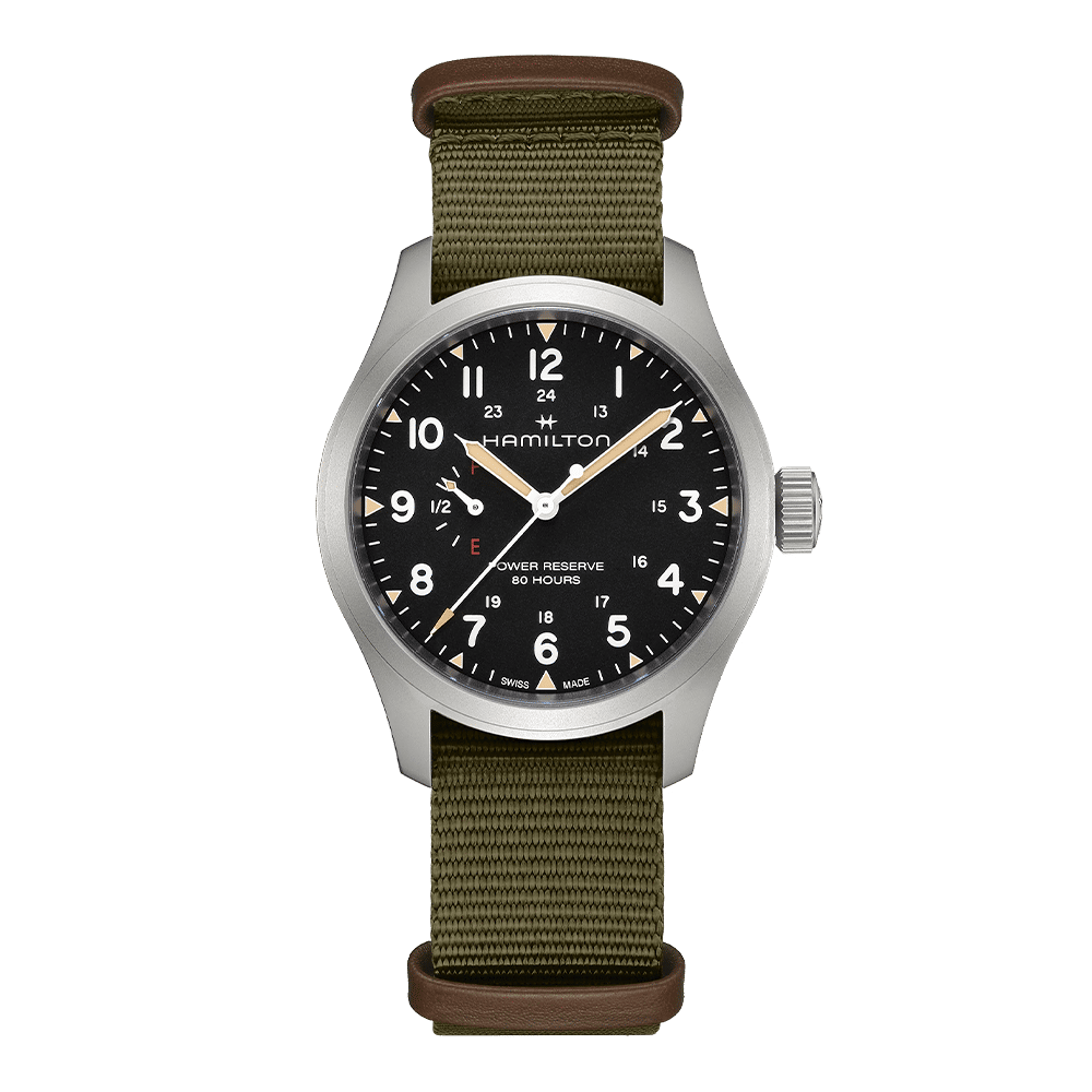 De Khaki Field Mechanical Power Reserve 40mm houdt het historische ontwerp en de essentiële functionaliteit van de Khaki familie in ere. Tegelijkertijd plaatst dit vernieuwende horloge moderne functies en de nieuwste horlogetechnologie voorop. Met het nieuwe handmatig opwindbare H-23 uurwerk, dat exclusief voor Hamilton ontworpen door ETA, is de gangreserve van 80 uur (voor het eerst) rechtstreeks op de wijzerplaat af te lezen. Uitgerust met een stevige groene NATO-band, geeft de zwarte wijzerplaat trots de vermelding ‘gangreserve 80 uur’ weer, samen met de aanduidingen ‘F’ (vol) en ‘E’ (leeg), om dit uitzonderlijke en functionele kenmerk te benadrukken.