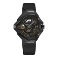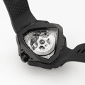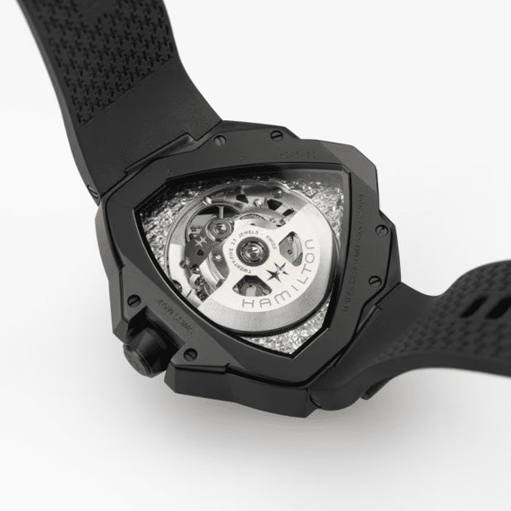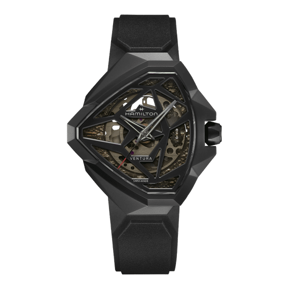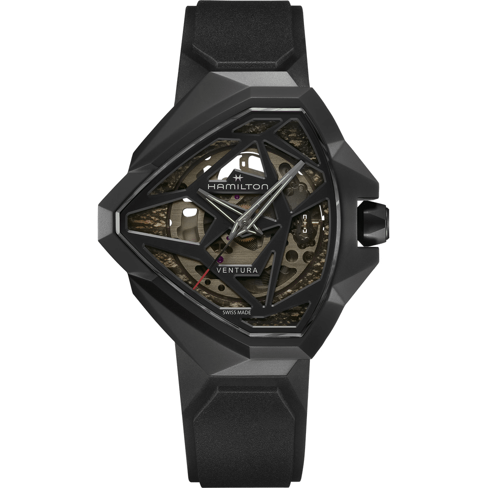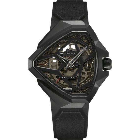 De Ventura Edge Skeleton breekt met traditie en verkent de grenzen van modern horlogedesign. Dit model breekt met de iconische driehoekige Ventura-kaststructuur en introduceert een gedurfd nieuw architectonisch ontwerp. Dit donkere, mysterieuze horloge heeft een radicaal design en speelt met schaduw en licht, wat zorgt voor een ongewoon diepte-effect in zijn unieke vormgeving. Een donkerzwarte kast omsluit het H-10-S uurwerk, dat onthuld wordt door een opengewerkte wijzerplaat verfraaid met een kleurverloop. Dit horloge heeft een zwarte rubberen band.