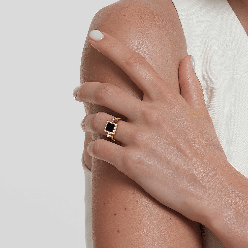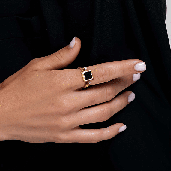 18 karaats geelgouden ring, diamant kleur GH, zuiverheid SI 0,25 ct, onyx, 26 stenen