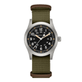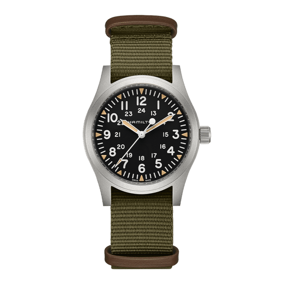 42mm matte roestvrijstalen kast, display met drie wijzers, donkere wijzerplaat met lichtgevende cijfers, indexen met uren en minuten, duurzame NATO-band: De nieuwe Khaki Field Mechanical, een getrouwe recreatie van zijn originele voorganger uit de jaren ‘60, en vormt een getrouwe weergave van de stijl die zo kenmerkend is voor het militaire erfgoed van Hamilton. Dit model hier, geïnspireerd door het leger en gemaakt om lang mee te gaan, is het originele soldatenhorloge.