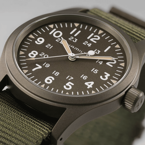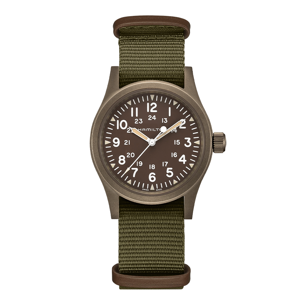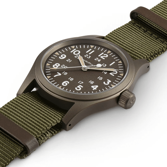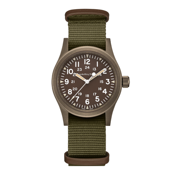 38 mm roestvrijstalen kast, drie wijzers, donkere wijzerplaat met lichtgekleurde cijfers, driehoekige indexen met oud radiumkleurige Super-LumiNova®, duurzam NATO-bandje: De nieuwe Khaki Field Mechanical, een getrouwe recreatie van zijn originele voorganger uit de jaren ‘60, en vormt een getrouwe weergave van de stijl die zo kenmerkend is voor het militaire erfgoed van Hamilton. De kast van het originele soldatenhorloge is nu voorzien van Hamiltons unieke 'Earth' gekleurde PVD-coating.
