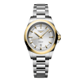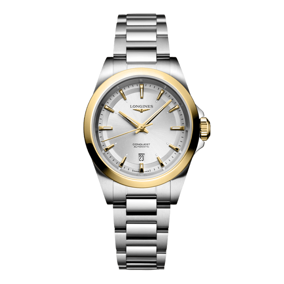 CONQUEST, L3.320.5.70.6, automaat horloge, Ø 30.00 mm, roestvrij staal en 18-karaats geelgouden cap 200.Datum, zelfopwindend mechanisch uurwerk met 28.800 vibraties per uur, een balansveer van monokristallijn silicium en een gangreserve van ongeveer 45 uur. Tot 10 bar, krasbestendig saffierglas met meerdere lagen anti-reflecterende coating aan beide zijden. Sunray zilver wijzerplaat, zwitsers super-luminova®.Roestvrij staal band, met drievoudige vouwsluiting en drukknoppen.