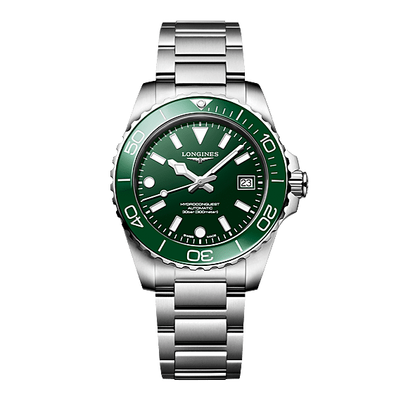 De HYDROCONQUEST-collectie combineert modern design met bewezen prestaties. Aangedreven door een exclusief automatisch LONGINES kaliber, waterdicht tot 30 bar (300 m), met een in één richting draaiende lunette, een geschroefde kroon en een geschroefd kastdeksel.