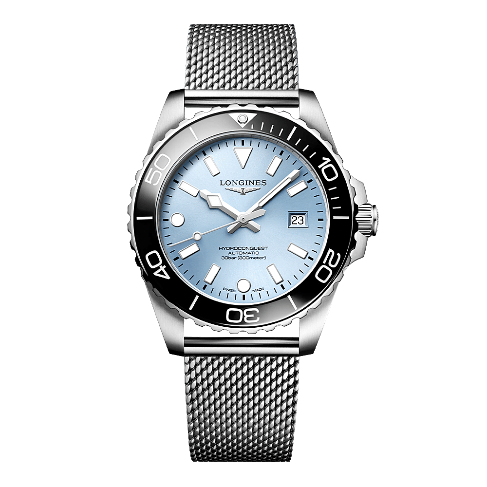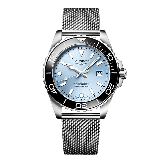 De HYDROCONQUEST-collectie combineert modern design met bewezen prestaties. Aangedreven door een exclusief automatisch LONGINES kaliber, waterdicht tot 30 bar (300 m), met een in één richting draaiende lunette, een geschroefde kroon en een geschroefd kastdeksel.