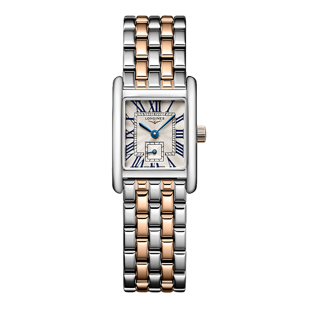 Quartz horloge, 21.50 x 29.00 mm, roestvrij staal met kroon van 18-karaats roségoud, L5.200.5.71.7Tot 3 bar, krasbestendig saffierglas met meerdere lagen anti-reflecterende coating aan beide zijden.Zilver 'flinqué' wijzerplaat.Roestvrij staal en 18-karaats roségouden cap 200 band, met drievoudige vouwsluiting en drukknoppen.