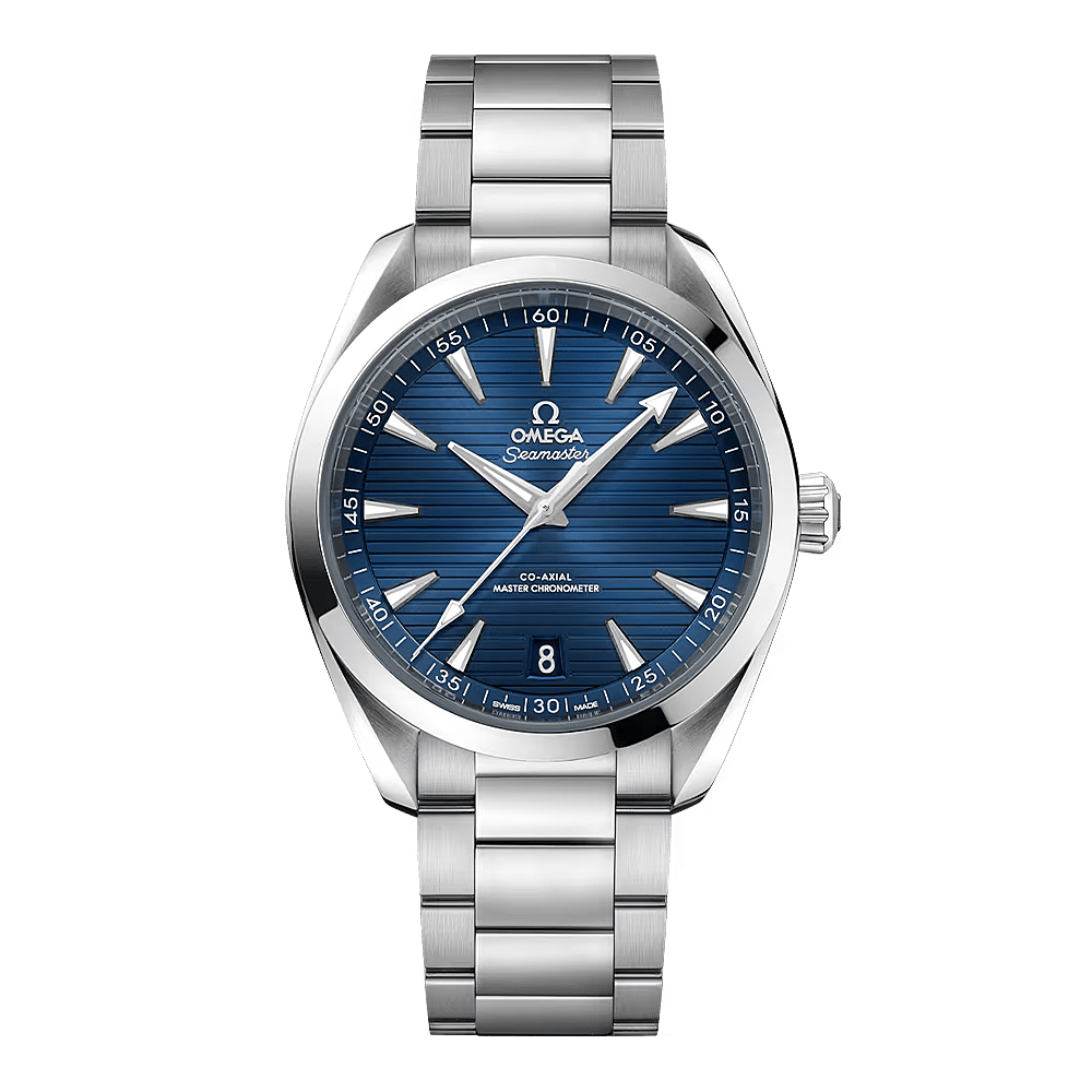 De Seamaster Aqua Terra is een prachtig eerbetoon aan OMEGA's rijke maritieme erfgoed. Dit symmetrische model van 41 mm is vervaardigd uit roestvrij staal en heeft een golvend design op de achterkant.De blauwe wijzerplaat is geborsteld en onderscheidt zich door een horizontaal "teak"-patroon, geïnspireerd op de houten dekken van luxe zeilboten. Verder is er een datumvenster op 6 uur en gerhodineerde wijzers en indexen gevuld met witte Super-LumiNova.Dit uurwerk, geleverd met een gepolijste en geborstelde armband, wordt aangedreven door het OMEGA Master Chronometer kaliber 8900, gecertificeerd volgens de hoogste industrienorm door het Zwitserse Federale Instituut voor Metrologie (METAS).