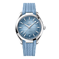 Deze 41 mm Aqua Terra heeft een symmetrisch vormgegeven horlogekast van gepolijst en geborsteld roestvrij staal en wordt gecombineerd met een in de horlogekast geïntegreerde blauwe band van rubber, die is voorzien van een solide, gepolijste schakel van roestvrij staal.De wijzerplaat met teakhoutmotief in OMEGA’s eigen kleur Summer Blue heeft een PVD-coating met zongeborstelde afwerking en is gelakt met een kleurverloop om de waterdichtheid van het horloge aan te geven. Het heeft gerhodineerde wijzers en uurmarkeringen opgevuld met lichtblauwe Super-LumiNova en is voorzien van een bijpassend datumvenster op 6 uur.Als u het horloge omdraait, ziet u een gestempeld logo ter herdenking van de Seamaster, waarop Poseidon met zijn drietand evenals twee zeepaardjes prijken: OMEGA's origineel uit 1956, het actuele design van het merk. Het horloge wordt aangedreven door OMEGA's Co-Axial Master Chronometer kaliber 8900, gecertificeerd volgens de hoogste standaard in de industrie door het Zwitserse Federale Instituut voor Metrologie (METAS).