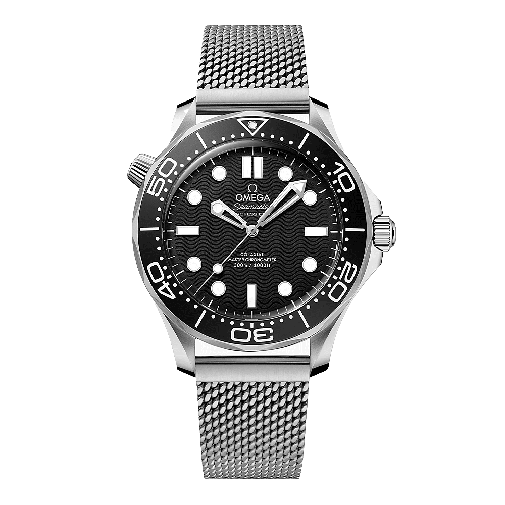 De Seamaster Diver 300M geniet sinds 1993 een legendarische status. De huidige moderne collectie omarmt dit beroemde maritieme erfgoed en combineert het met OMEGA's meest geavanceerde innovaties en design.Dit 42 mm model is vervaardigd uit roestvrij staal en heeft een zwarte, oxaal geanodiseerde aluminium bezelring met een duikschaal in witte Super-LumiNova.Ook de wijzerplaat is gemaakt van zwart aluminium en is lasergegraveerd met het iconische golfpatroon van de Diver. De opengewerkte wijzers en indexen zijn gerhodineerd en gevuld met witte Super-LumiNova, terwijl de overige markeringen, waaronder het OMEGA-logo, in wit zijn uitgevoerd.Het horloge wordt geleverd met een geborstelde mesh-armband met sluiting en wordt aangedreven door het OMEGA Co-Axial Master Chronometer Kaliber 8806, dat zichtbaar is door de saffierglazen achterkant.
