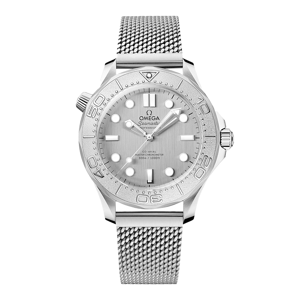 Sinds 1993 heeft de Seamaster Diver 300M een legendarische reputatie. De moderne collectie van vandaag de dag wordt gekenmerkt door het beroemde oceaanerfgoed, dat werd geactualiseerd met de meest geavanceerde innovaties en designs van OMEGA.Dit 42 mm model is vervaardigd uit roestvrij staal en is voorzien van een bezel van grade 5 titanium met een lasergravure van een duikschaal in positief reliëf en één stip witte Super-LumiNova op 12 uur.PVD roestvrij staal wordt gebruikt voor de geborstelde wijzerplaat en de gepolijste skeletonwijzers en -uurmarkeringen, die opgevuld zijn met witte Super-LumiNova. Andere markeringen, zoals het OMEGA logo, zijn in het zwart aangebracht.Het horloge wordt gecombineerd met een geborstelde meshband met een sluiting en wordt aangedreven door het OMEGA Co-Axial Master Chronometer kaliber 8806, dat te zien is door het saffierglazen kastdeksel.