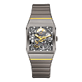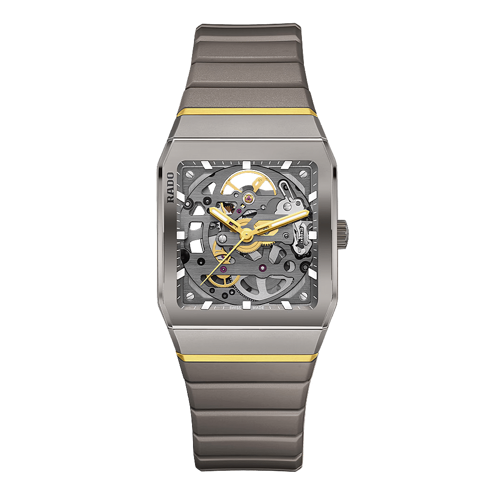 Sinds zijn debuut in 1983 staat de Rado Anatom symbool voor baanbrekend design en ultiem comfort. Nu, voor het eerst in de geschiedenis van Anatom, kunnen we dankzij een skeletontwerp een kijkje nemen in het hart van het horloge en het automatische kaliber R808 bewonderen. De wijzerplaat heeft prachtige details, zoals geborstelde onder- en bovenplaten, decoratieve elementen, geelgouden wijzers en witte Super-LumiNova®-indexen. Tegelijkertijd blijft het kenmerkende element van de Anatom behouden: een anatomische vorm die naadloos om de pols past. Het cilindrische saffierglas versterkt de ergonomische vorm van het horloge en creëert een vloeiende, doorlopende vorm die de kast en de armband met elkaar laat versmelten. De Anatom Skeleton is in vijf posities afgesteld en uitgerust met een antimagnetische Nivachron™-spiraalveer, waardoor hij ook een hoge nauwkeurigheid en een indrukwekkende gangreserve van 80 uur biedt.