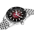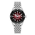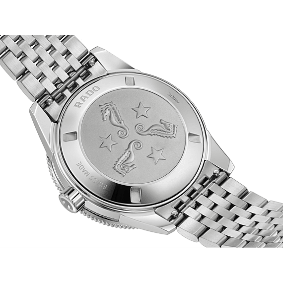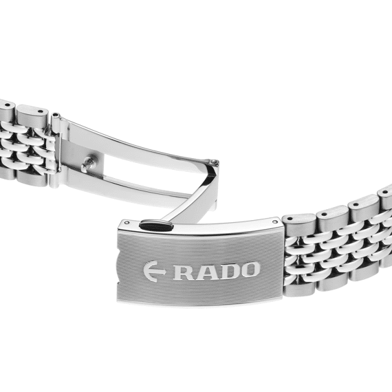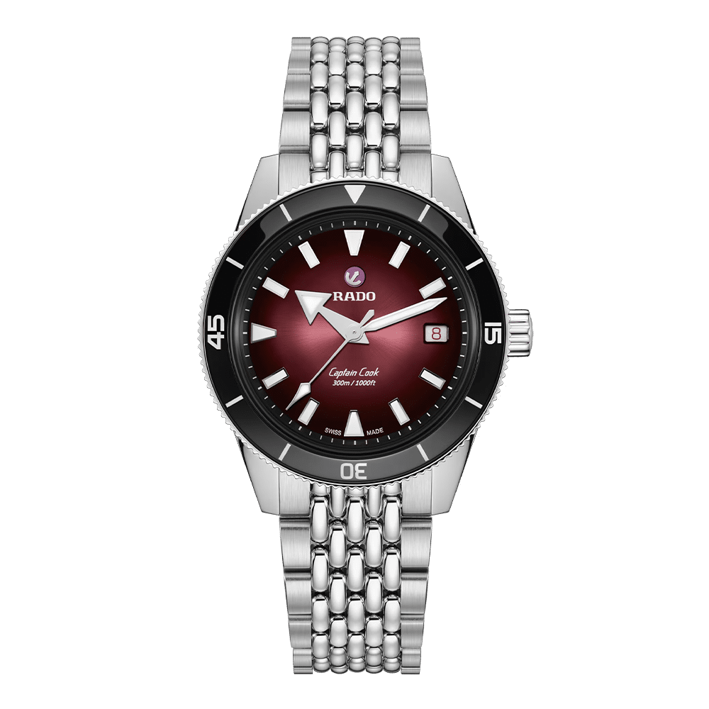Deze fascinerende Captain Cook, geïnspireerd op de originele editie uit 1962, geeft een prominente plaats aan de zwart-naar-bordeauxrode gradient wijzerplaat die schittert onder een boxvormig saffierglas. De opvallende look wordt versterkt door rhodiumkleurige indexen en wijzers met Super-LumiNova en door de gepolijste zwarte bezelinzet in Rado's kenmerkende hightech keramiek. Het horloge wordt aangedreven door het Rado-kaliber R763, een automatisch uurwerk met 25 juwelen en drie wijzers, met een antimagnetische Nivachron-spiraalveer voor verbeterde betrouwbaarheid en nauwkeurigheid. De roestvrijstalen kast met een diameter van 39 mm is waterdicht tot 30 bar (300 m) en vormt een aanvulling op de bestaande kastmaten van 37 mm en 42 mm, waardoor de Captain Cook-serie nog aantrekkelijker wordt voor polsen van alle maten. Het horloge wordt gedragen met een vintage-stijl roestvrijstalen armband met rijstkorrelpatroon voor klassieke gelegenheden, die gemakkelijk kan worden vervangen door twee extra bandjes: een bordeauxrood NATO-stijl textielbandje met zwarte rand en een zwart leren bandje. Rijk, robuust en betrouwbaar – een perfecte metgezel voor actieve avonturiers.
