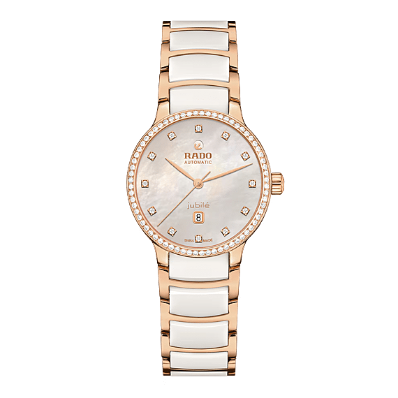 De Centrix Super Jubilé biedt de perfecte balans tussen luxe, comfort en duurzaamheid. De kast van 30,5 mm is vervaardigd uit roestvrij staal en afgewerkt met een roségouden coating. Hij wordt bekroond door een luxueuze lunette bezet met 68 Top Wesselton, VS-SI, briljantgeslepen diamanten. Een gebogen saffierglas, met een antireflectiecoating aan beide zijden, vermindert schitteringen en zorgt voor een onberispelijke leesbaarheid. Het hart van het horloge wordt gevormd door het automatische kaliber R582, dat zichtbaar is door de saffierglazen achterkant van de kast. Het is gereguleerd in vijf posities, uitgerust met een antimagnetische Nivachron™-spiraalveer voor uitzonderlijke nauwkeurigheid en biedt een gangreserve van 48 uur. De witte parelmoeren wijzerplaat is voorzien van 12 Top Wesselton, VS-SI, briljant geslepen diamanten indexen en een datumvenster op 6 uur. Elegant aangepaste lugs en een armband van gepolijst roestvrij staal met roségoudkleurige coating en witte hightech keramische middenstukken maken het geheel af. De armband wordt gesloten met een drievoudige roestvrijstalen sluiting.