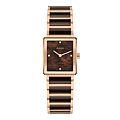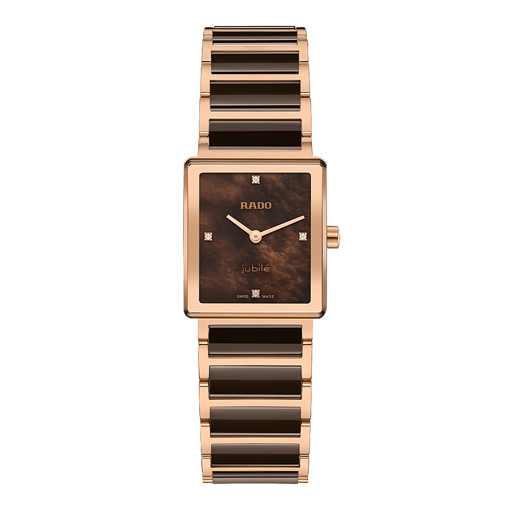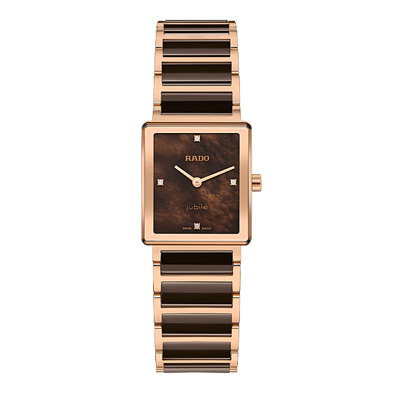 Op het eerste gezicht vallen de wijzerplaat met vier diamanten van Rado, de roségouden kleur en de schakels van hightech keramiek op. Een traditionele Rado Integral. Maar als je beter kijkt – naar de wijzerplaat – ja, die is van parelmoer, in bruin. Uitzonderlijk. Opvallend. Elegant.De roestvrijstalen kast met een gepolijst roségouden PVD-oppervlak wordt geflankeerd door een roestvrijstalen armband met roségoudkleurig PVD en gepolijste bruine high-tech keramische schakels. Een roségoudkleurige metallisatie omlijst het antireflecterende, gebogen en afgeschuinde saffierglas dat de glanzende parelmoeren wijzerplaat beschermt. Het minimalistische, kenmerkende Rado-ontwerp wordt aangedreven door het R209-kwartsuurwerk: Zwitserse precisie in een 6-steen twee-wijzerhorloge. Het saffierglas en de high-tech keramische schakels zorgen voor comfort, en de rondingen van het glas sluiten aan op de armband, die zich aanpast aan de ronding van uw pols (een detail voor de kenner). Een iconische Rado Integral, verrijkt met een ontwapenend elegante parelmoeren wijzerplaat.