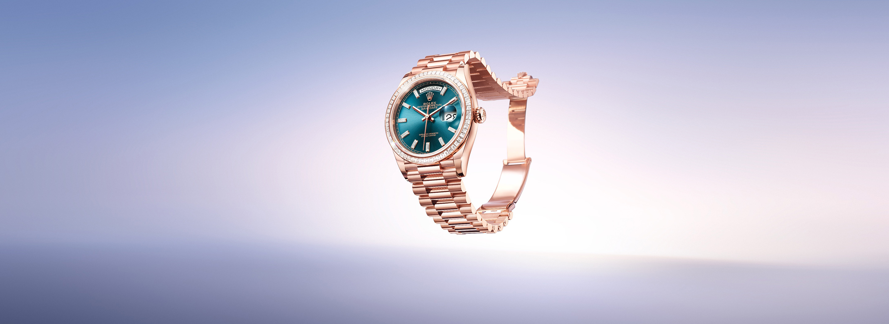 De Day Date 36 van 18 kt Everose-goud is voorzien van een blauwgroene wijzerplaat en is versierd met tien baguette-geslepen diamanten. Deze wijzerplaat met zijn opvallend diepe, intense kleur is met name verkrijgbaar op een versie waarvan de bezel bezet is met 60 trapeze geslepen diamanten. Deze bezel was voorheen alleen voorbehouden aan de Day Date 36 van 950 platina en de Day-Date 40 van 18 kt goud of 950 platina. Zijn creatie vraagt tijd en geduld van de steenzetter, die elke steen één voor één met de hand plaatst.