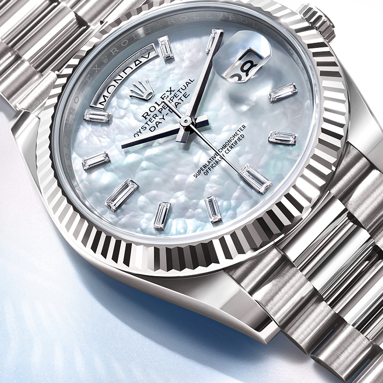 Een tweede nieuwe versie van de Day-Date 40, van 18 kt witgoud, is voorzien van een wijzerplaat van glanzend wit parelmoer. Dit natuurlijke materiaal wordt voor het eerst op dit model gebruikt. Op de gepresenteerde versie wordt de glans van het parelmoer versterkt door de tien baguette-geslepen diamanten die als uurmarkeringen op de wijzerplaat staan.