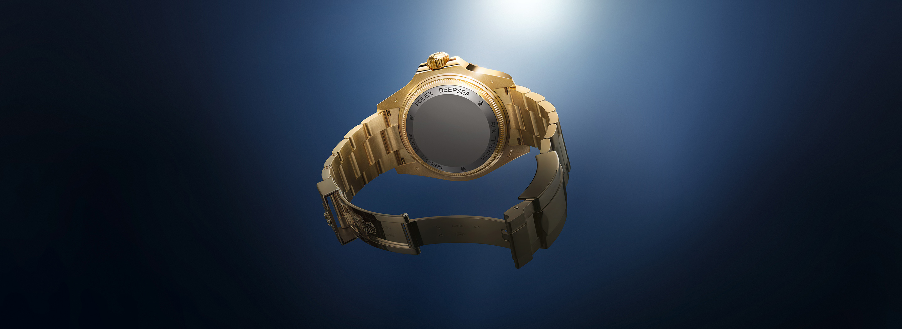 De Oyster-band van de nieuwe Rolex Deepsea is uitgerust met een Oysterlock-veiligheidsvouwsluiting, die voorkomt dat hij per ongeluk opengaat. Hij is ook voorzien van het Rolex Glidelock-verlengsysteem, dat eveneens werd ontworpen door het merk en gepatenteerd. Dit inventieve getande mechanisme, geplaatst onder de sluitingsklep, maakt een zeer fijne afstelling van de bandlengte zonder gereedschap mogelijk. De 18 kt geelgouden Oyster-band van de Rolex Deepsea is bovendien voorzien van de gepatenteerde en door het merk ontworpen keramische inlegschijven binnen in de schakels, die extra soepelheid en duurzaamheid bieden.