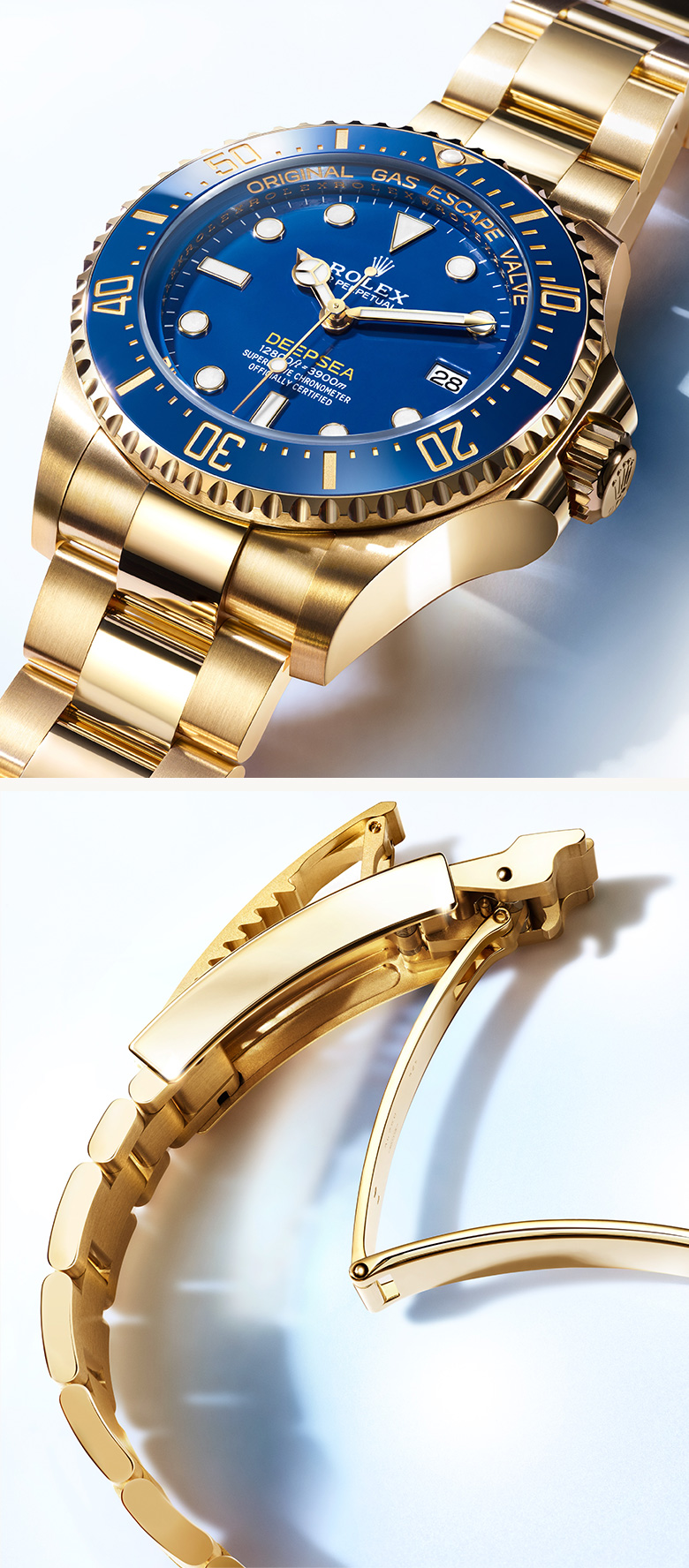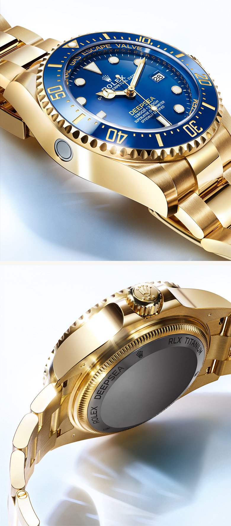 Dit duikhorloge wordt voor het eerst gepresenteerd in 18 kt geelgoud en is voorzien van een Cerachrom-bezelring van blauwe keramiek met een 60-minutenverdeling. Ook heeft deze versie een blauwgelakte wijzerplaat waarop in poedergeel de naam ‘DEEPSEA’ staat weergegeven.