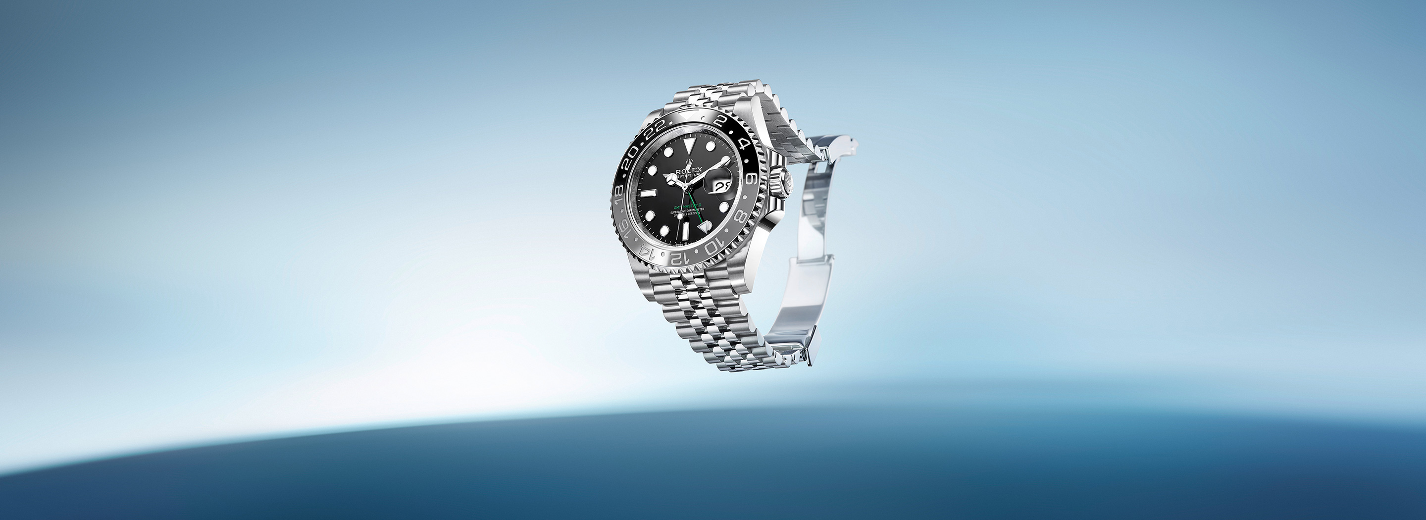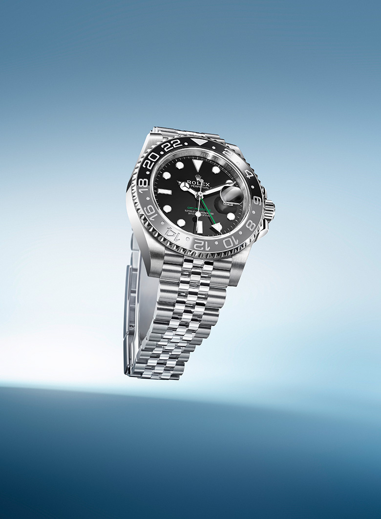 De GMT-Master, ontworpen als navigatiehulpmiddel voor professionals die over de hele wereld reizen, is verworden tot hét horloge voor reizigers. Zijn ontwerp is uniek en direct herkenbaar, met een bidirectioneel draaibare bezel en een bezelring met 24-uursaanduiding die verkrijgbaar is in verschillende tweekleurencombinaties – waarbij de onderste helft de dag symboliseert en de bovenste helft de tijd ’s nachts – evenals in één enkele kleur.