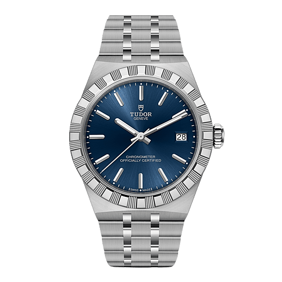 Met zijn geïntegreerde metalen armband, die naadloos aansluit op de kast, straalt deze TUDOR Royal vloeiende lijnen en een onmiskenbare stijl uit. De armband wordt gekenmerkt door drie brede, gesatineerde schakels tussen twee slankere, gepolijste elementen. De gladde afwerking van de oppervlakken en randen, evenals de “T-fit”-sluiting, benadrukken het belang dat TUDOR hecht aan draagcomfort om de pols.
