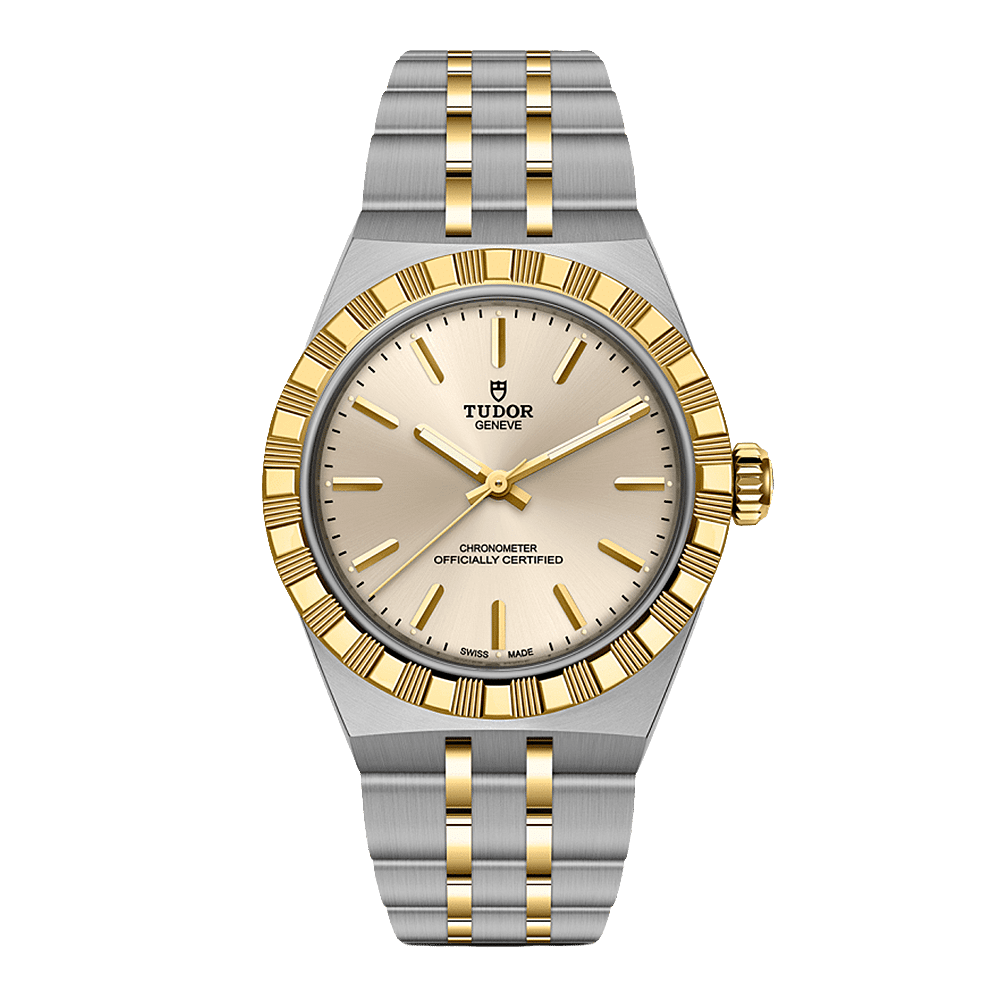 Met zijn geïntegreerde metalen armband, die zorgt voor een ononderbroken lijn met de kast, belichaamt deze TUDOR Royal vloeiende lijnen en een onmiskenbare stijl. Gekenmerkt door drie brede, gesatineerde schakels tussen twee slankere, gepolijste elementen, benadrukken de gladde afwerking van de oppervlakken en randen, evenals de aanwezigheid van de “T-fit”-sluiting, het belang dat TUDOR hecht aan comfort om de pols.