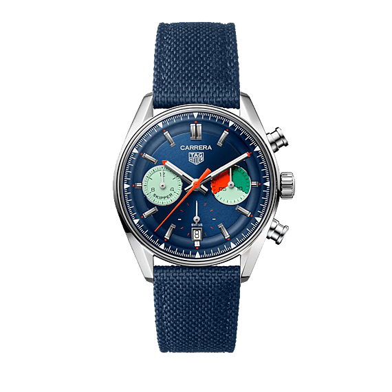 De natuurlijke band tussen zeilen en motorsport, gedreven door een onvermoeibare passie voor precisie en snelheid, vormt de inspiratie voor deze iconische TAG Heuer Carrera “Skipper”. Een gedurfd eerbetoon aan onze zeilgeschiedenis, tot uiting gebracht in een karakteristiek kleurenschema. Onmiskenbaar iconisch. De zeilvariant van de Heuer Skipper brengt een frisse interpretatie van de wijzerplaat met dubbele teller, gekenmerkt door een opvallende combinatie van blauwgroen, oranje, groen en blauw. Stap zelfverzekerd aan boord met deze klassieke Carrera-stalen kast, uitgerust met een regatta aftelindicator en bestand tegen water tot 100 meter diep. Laat u meevoeren door de charme van de open zee en geniet van sportieve elegantie met de nieuwe duurzame blauwe textielen band, gemaakt voor optimaal comfort. Deze Skipper is een directe erfgenaam van het originele model, geboren uit Jack Heuer’s samenwerking met de America’s Cup, ’s werelds oudste en meest prestigieuze zeilrace, waar hij in de jaren 60 officieel tijdwaarnemer was van het jacht Intrepid.