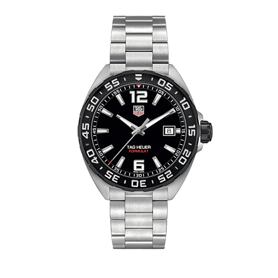Met een uniek wijzerplaatontwerp en echte autosportgeest is deze 41mm TAG Heuer Formula 1 een professioneel sporthorloge. Witte Super-LumiNova®-indexen en uur- en minutenwijzers zorgen voor optimale leesbaarheid in alle omstandigheden. Een zeer resistent saffierglas zorgt voor waterbestendigheid tot 200 meter. De 41mm stalen horlogekast is omgeven door een zwarte unidirectioneel draaiende bezel met een 60-minuten schaalverdeling. De geborstelde stalen armband sluit met een stalen vouwsluiting met dubbel veiligheidssysteem en een rijverlenging om over de mouw van een racepak te passen.