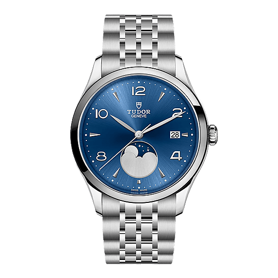 De TUDOR 1926 Luna is afgewerkt met een zwarte, blauwe of champagnekleurige zongeborstelde en in vintage-look gewelfde wijzerplaat en een TUDOR metalen zevendelige schakelband. De vele details op de wijzerplaten in de 1926-lijn creëren een prachtig complex lichtspel dat perfect aansluit bij de zwaardvormige wijzers in bijpassende kleuren. De maanfase-indicator op 6 uur geeft het horloge zijn poëtische finishing touch.