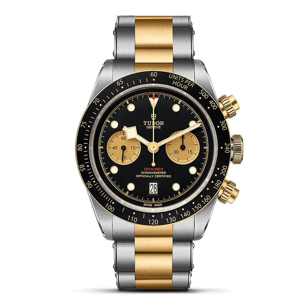 De Black Bay Chrono S&G blijft trouw aan de Black Bay-esthetiek en is voorzien van de beroemde "Snowflake"-wijzers, een kenmerk van duikhorloges van het merk sinds 1969, om een uitstekende leesbaarheid op de gewelfde wijzerplaat te garanderen. De wijzerplaat is verkrijgbaar in twee uitvoeringen: matzwart of champagnekleurig met een satijnen zonnestraalafwerking. De wijzerplaat heeft twee verzonken subwijzerplaten in contrasterende kleuren, respectievelijk champagne en matzwart, voor optimale leesbaarheid. De subwijzerplaten hebben een cirkelvormige korrelstructuur en zijn, geïnspireerd op de eerste generatie TUDOR-chronografen, voorzien van een 45-minutenteller en een datumvenster op 6 uur. De herkenbare kenmerken van de Black Bay zijn behouden gebleven in een kast van staal en geelgoud met een diameter van 41 millimeter. Kenmerkend voor de aandacht voor detail van het merk, is het ontwerp van de geelgouden drukknoppen, dat is geïnspireerd op de allereerste generatie TUDOR-chronografen. Een vaste lunette van geelgoud met een inzetstuk van zwart geanodiseerd aluminium met tachymeterschaal completeert het stijlvolle uiterlijk van deze sportieve chronograaf.