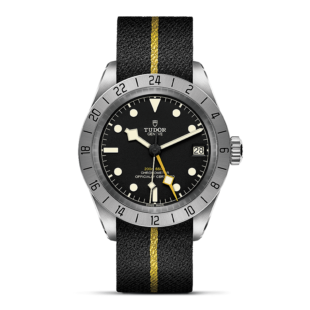 Op het Black Bay Pro-model wordt de referentietijd aangegeven door een hoekige gele "Sneeuwvlok"-wijzer, een esthetisch kenmerk van TUDOR, die elke 24 uur een volledige omwenteling over de wijzerplaat maakt. De lokale tijd wordt aangegeven door een andere, kortere "Sneeuwvlok"-wijzer die wordt ingesteld door een springend uur, dat zowel vooruit als achteruit kan worden bewogen. De datum, weergegeven door een venster op 3 uur, is gekoppeld aan de lokale tijdwijzer, zodat bij het instellen van de tijd en het passeren van middernacht in retrograde, deze direct naar de vorige dag springt. Een zeer ongebruikelijke, verfijnde en bijzonder praktische functie voor de gebruiker.